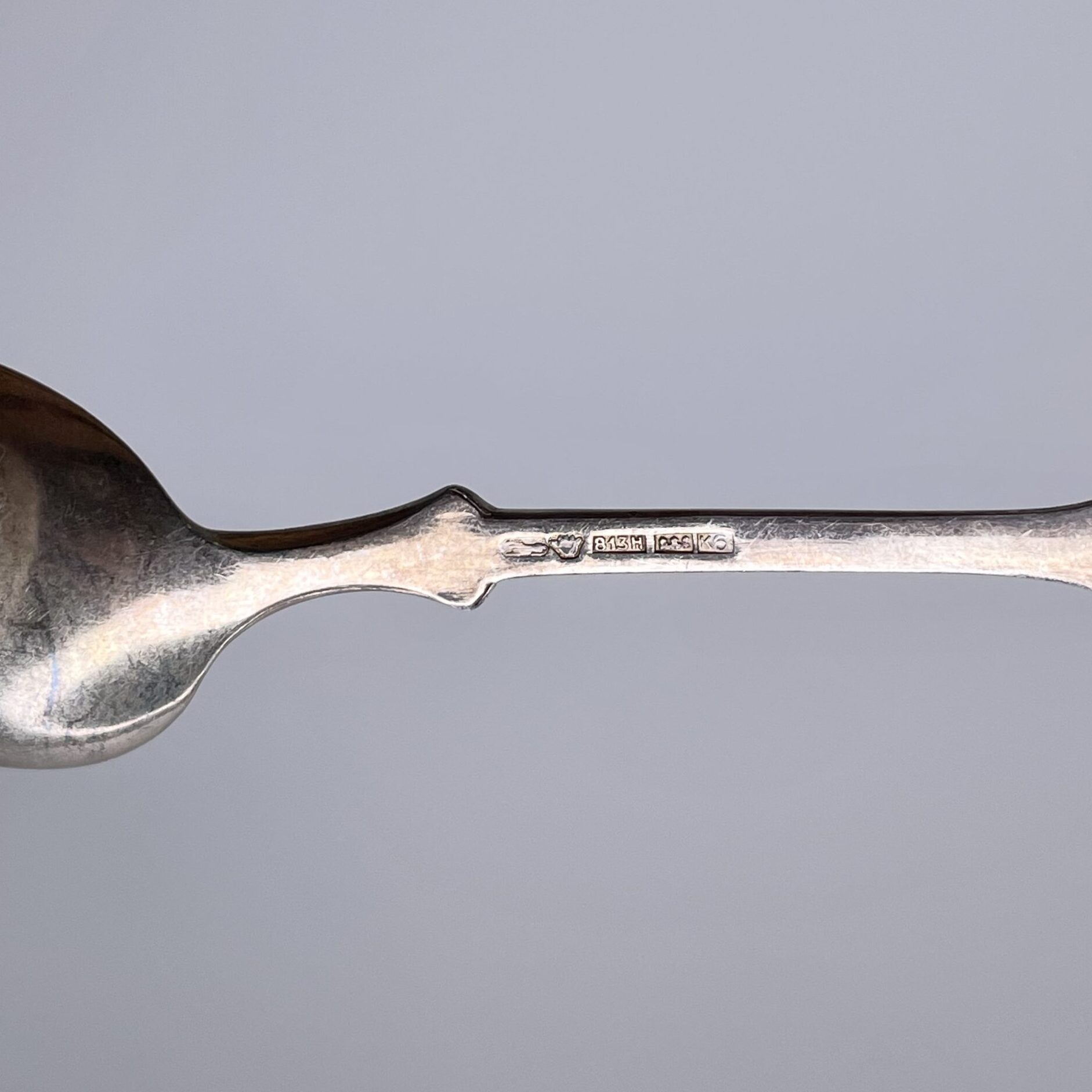 Material: 6 pieces silver 813H spoons. Box: outside black faux leather, inside blue velvet and white fabric.