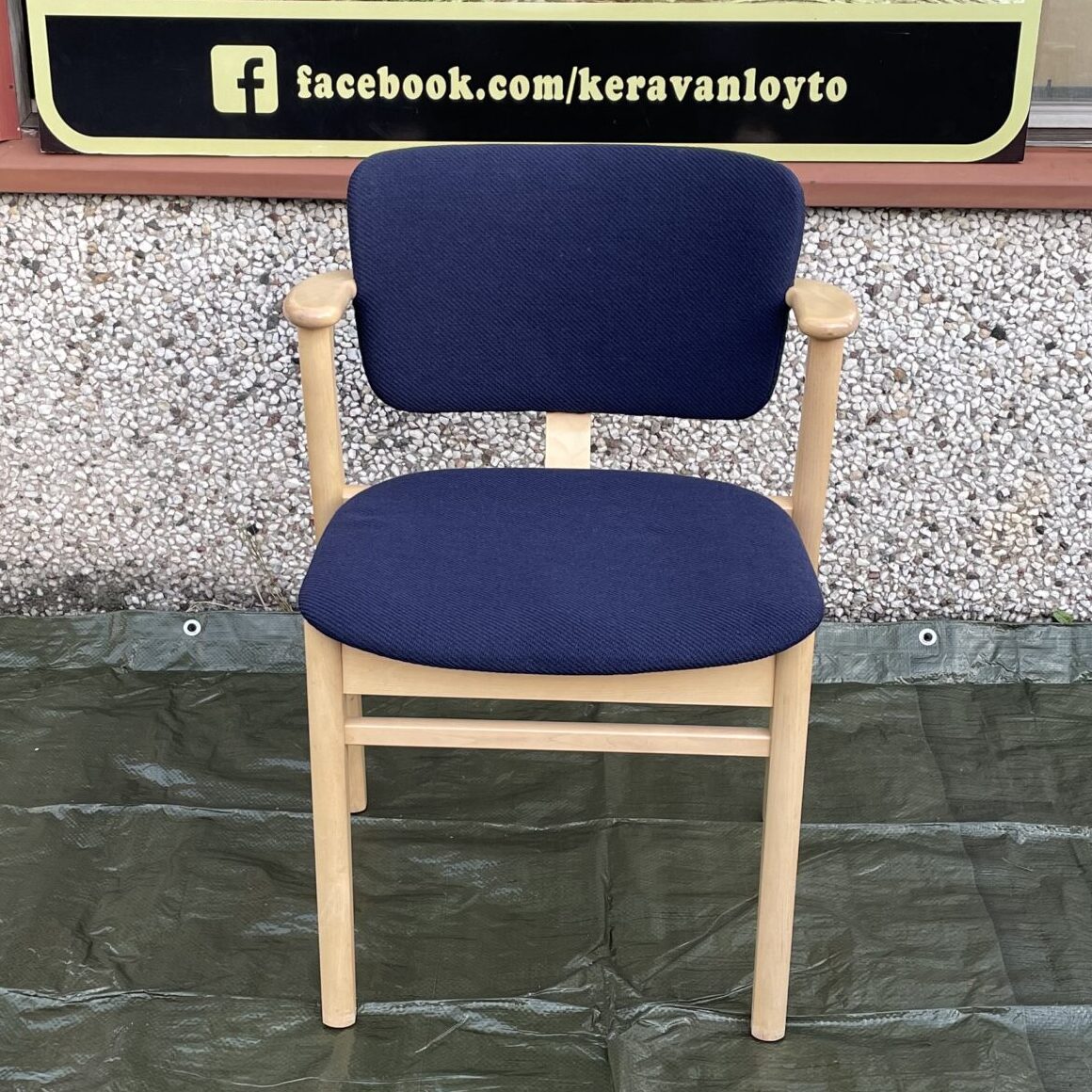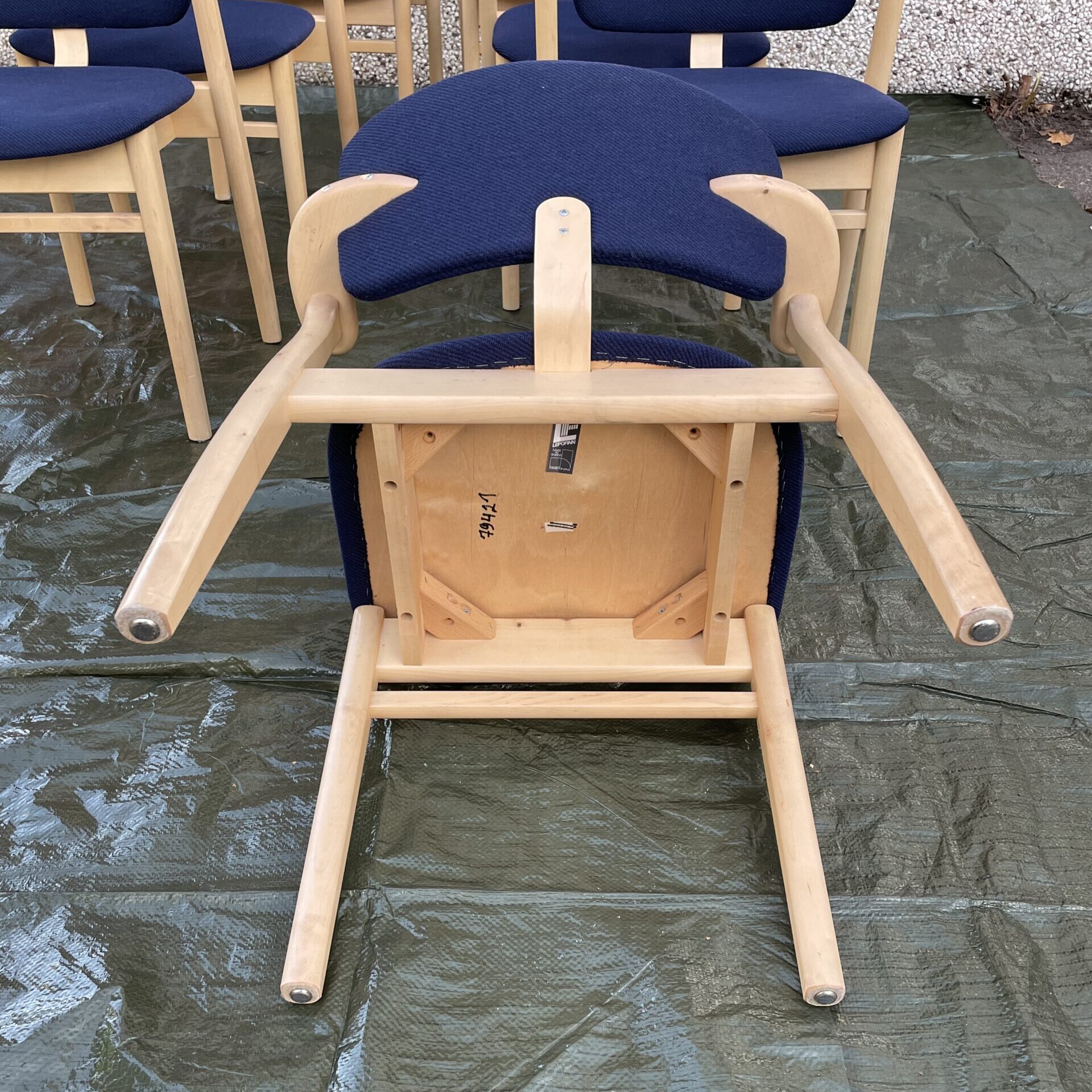 Material and color: Wooden frame with dark blue fabric upholstery. Metal studs under the chair legs.