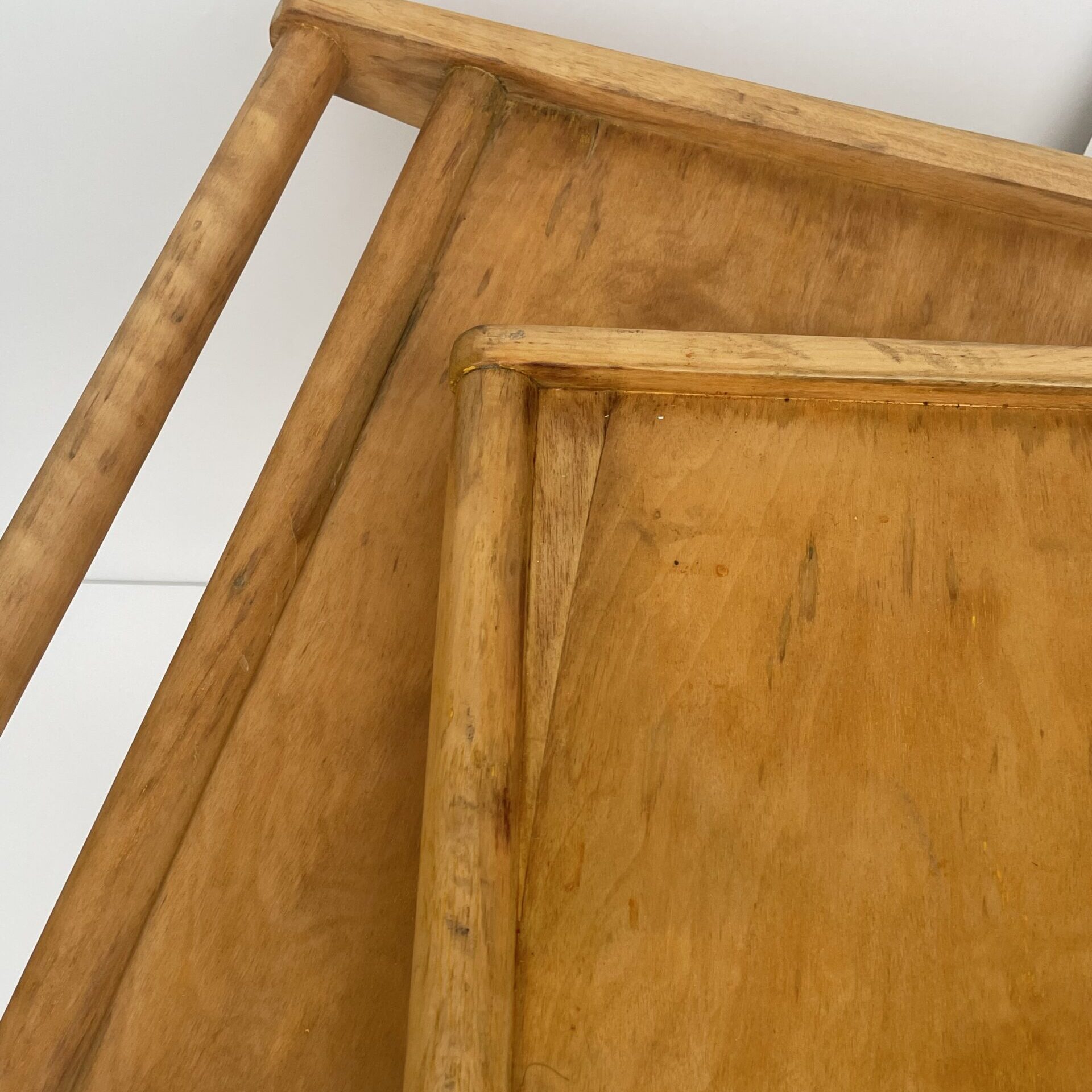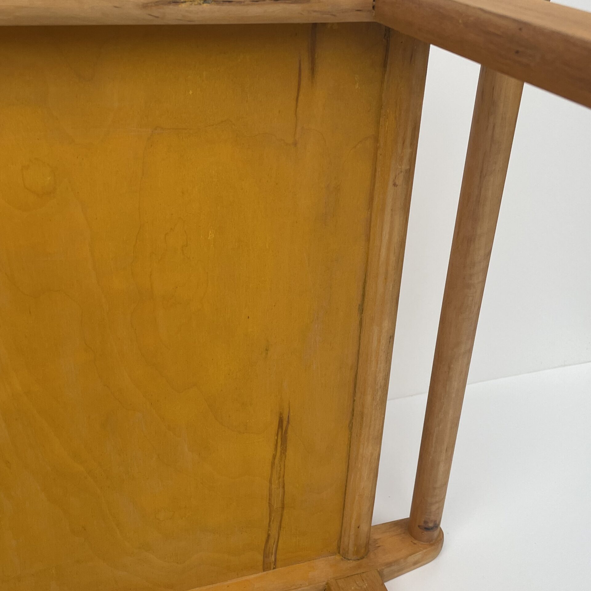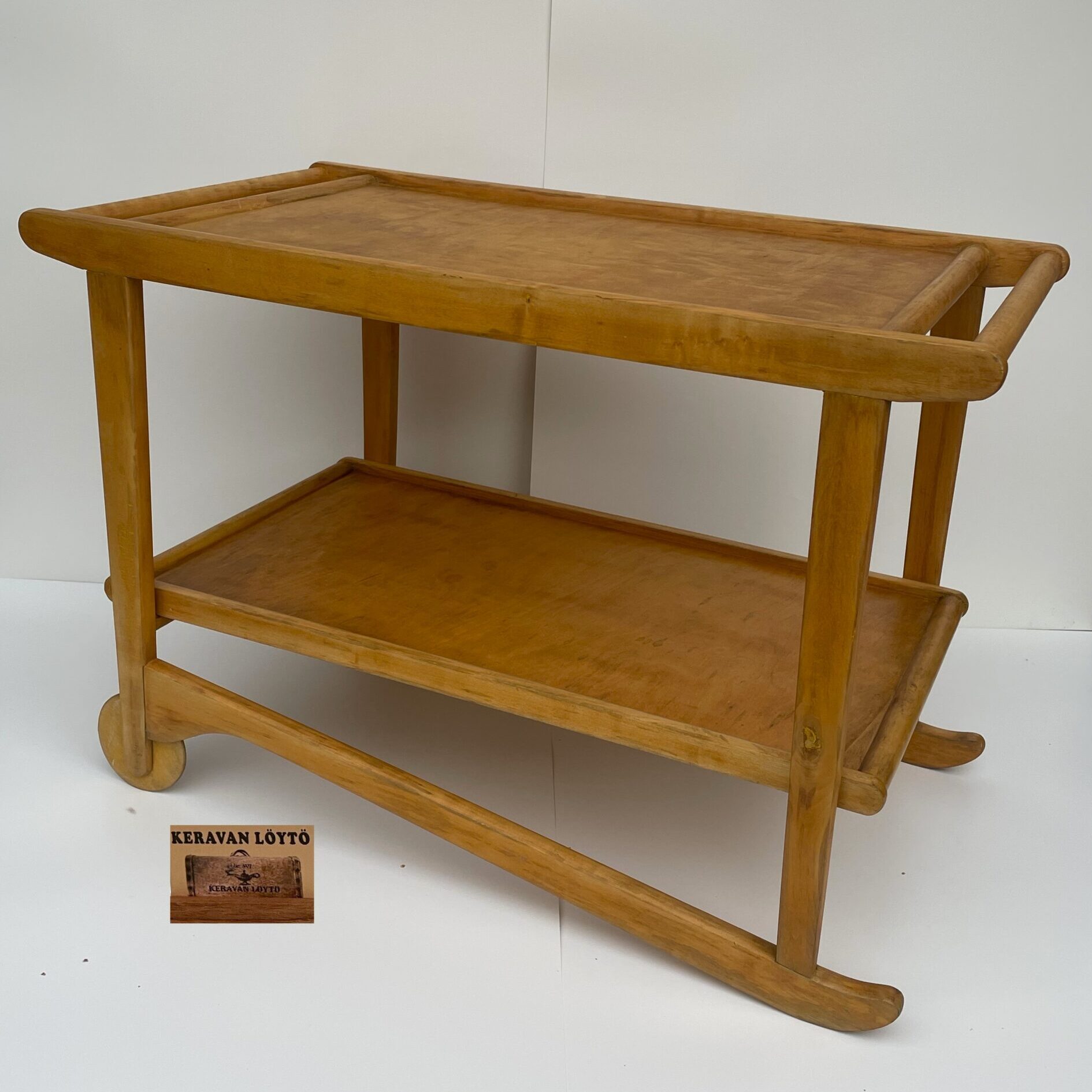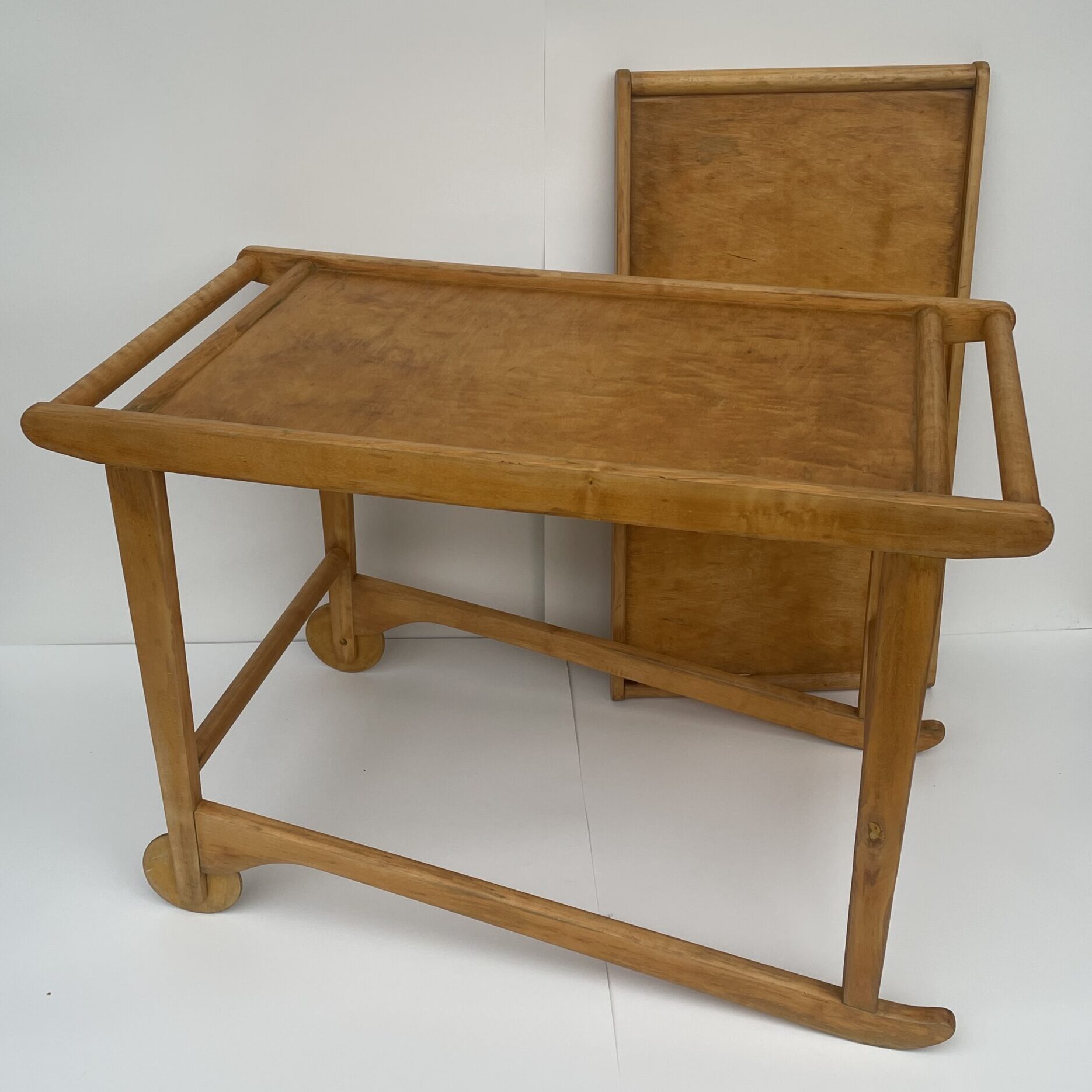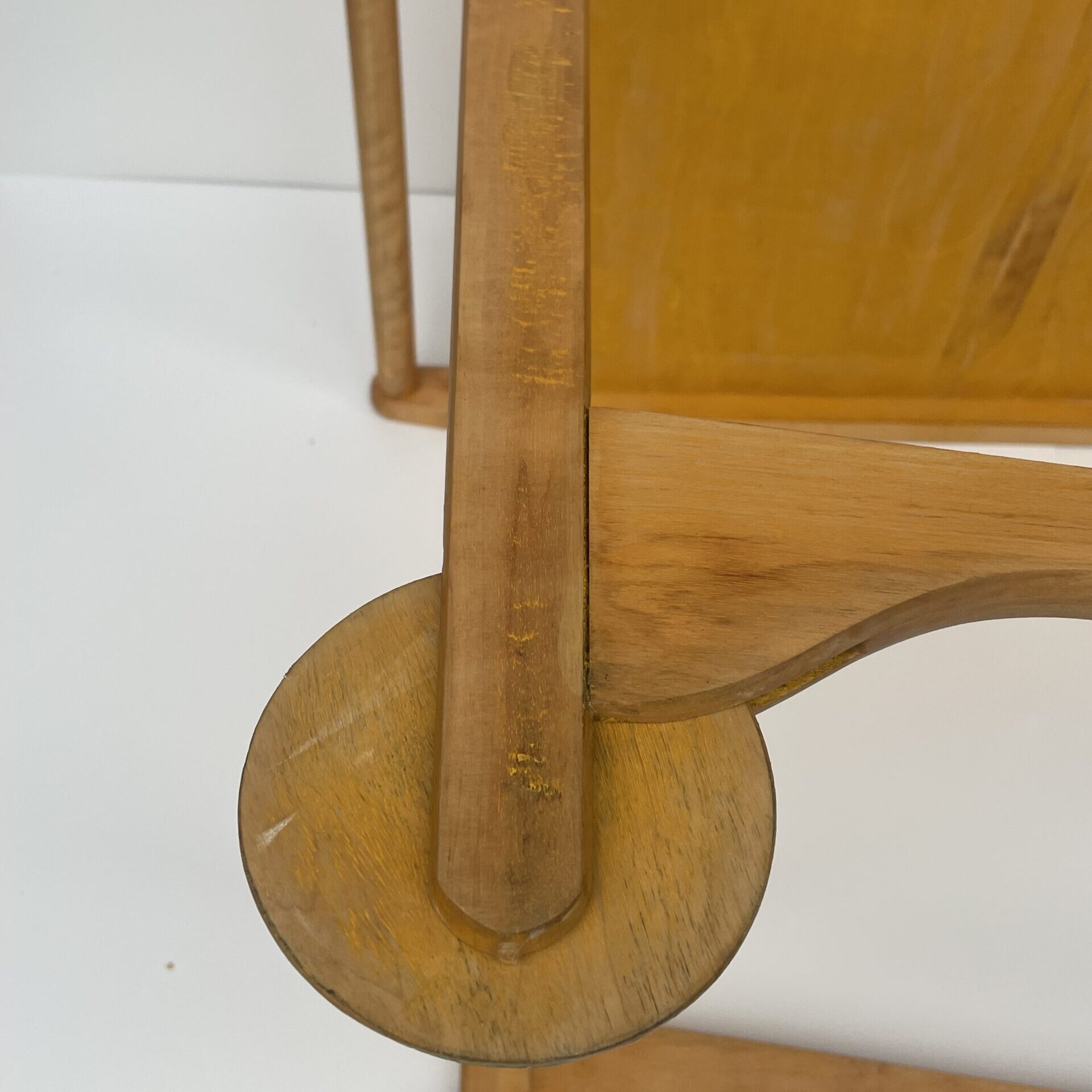 Observations: Age-related wear. The serving trolley was painted yellow by its previous owner, and the paint was subsequently removed from the main surfaces. Some paint still remains on the underside of the trolley. In addition, there is a veneer extension in the tray.