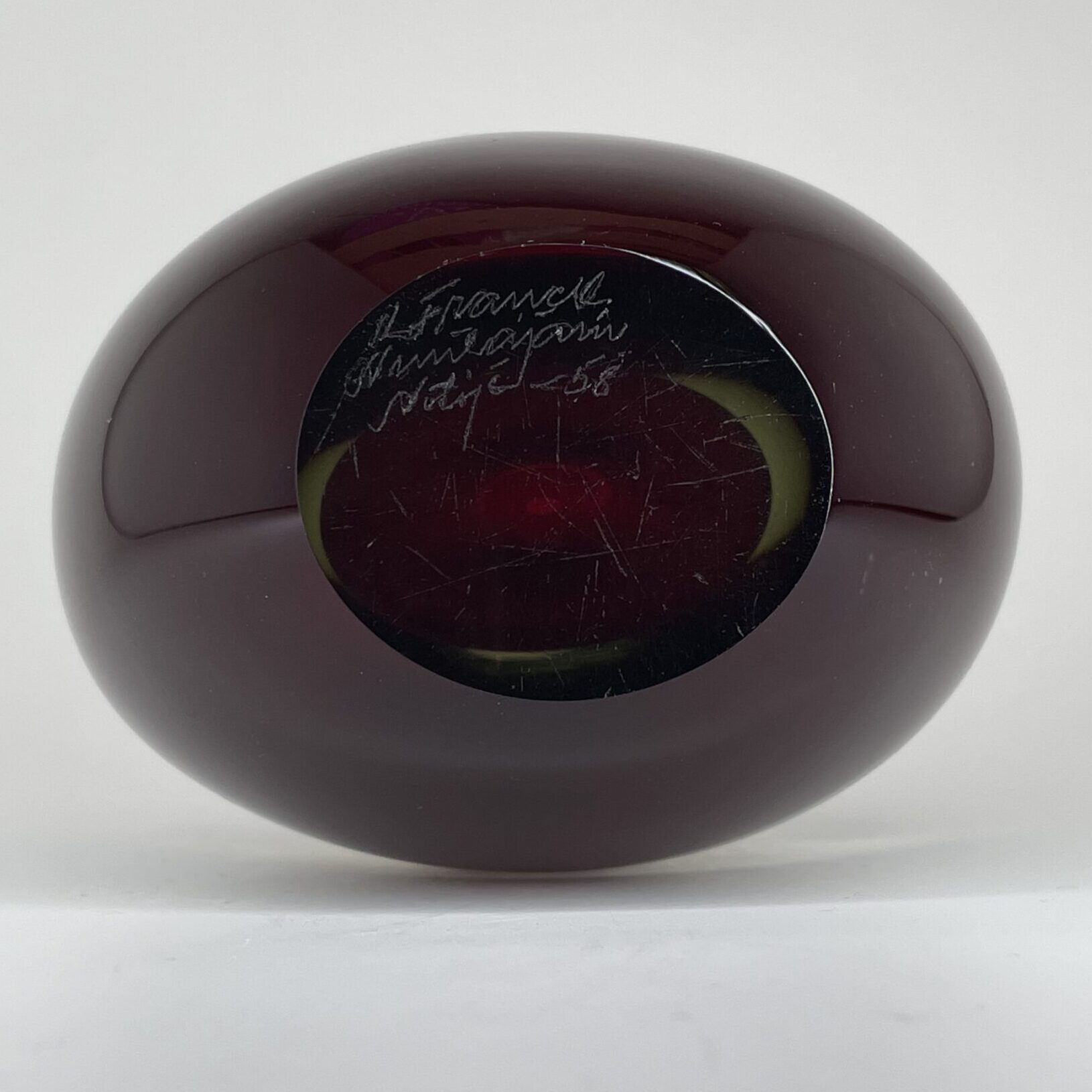 Observations: The art glass is intact, with some signs of use; light scratching on the side and some scratching on the bottom. See more details in the pictures.