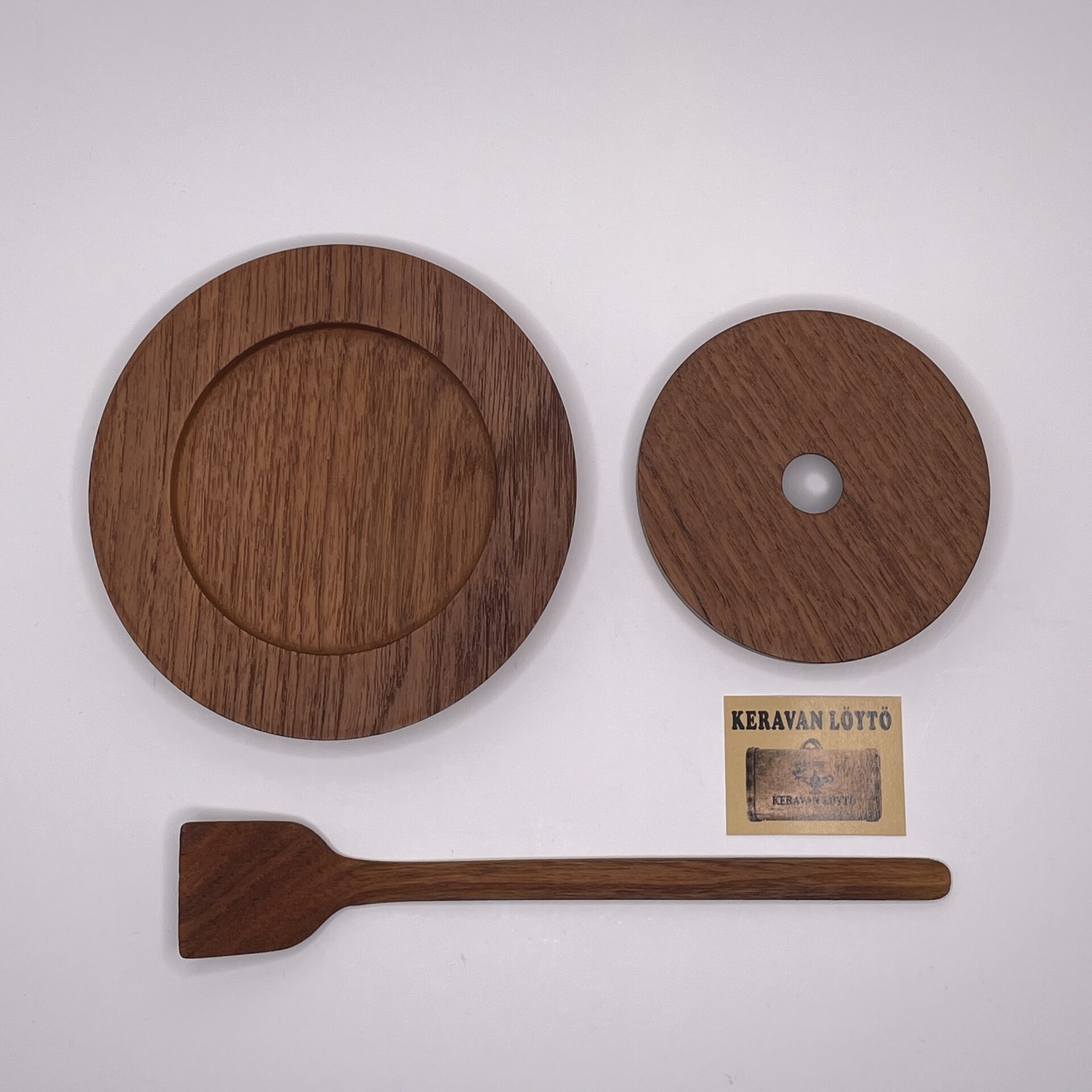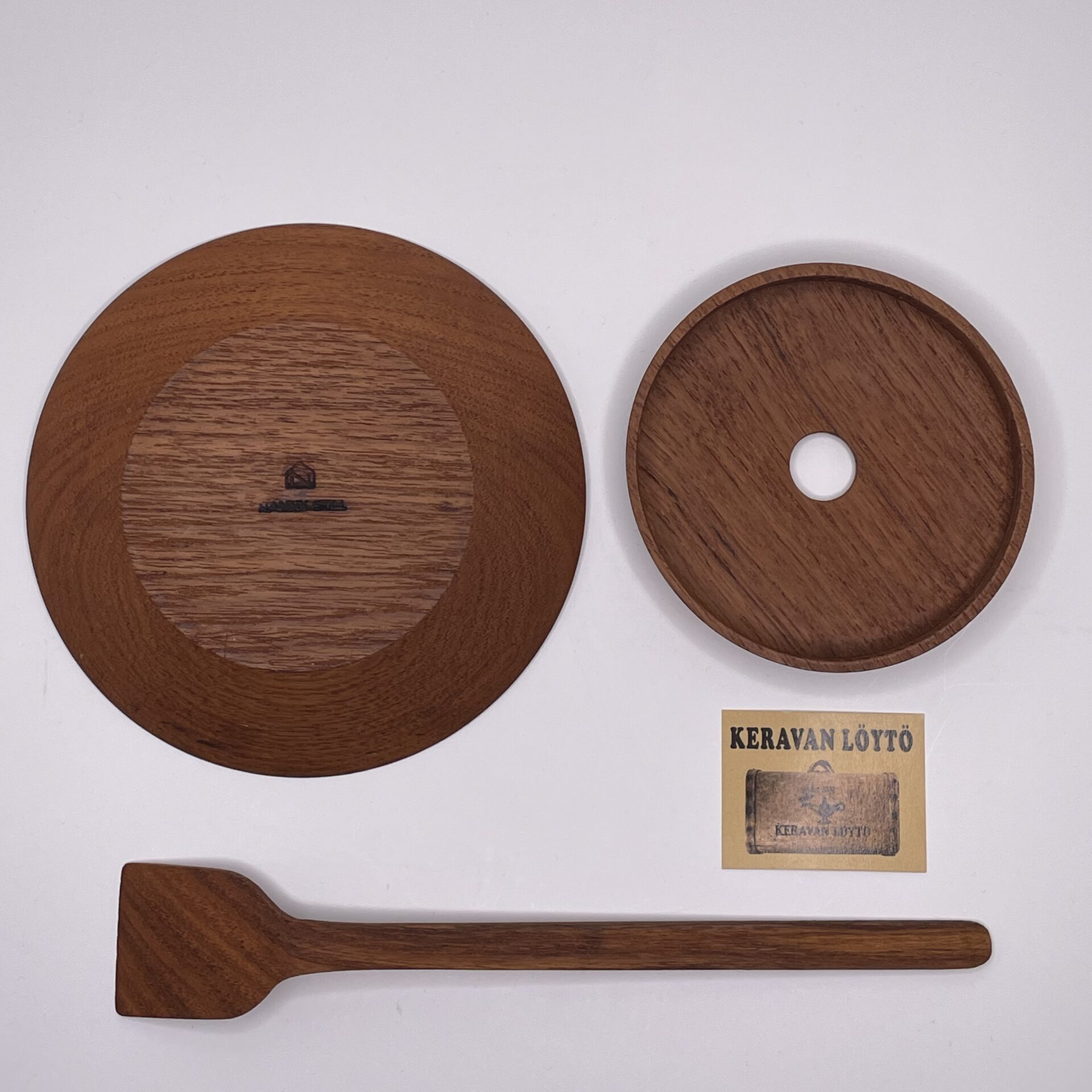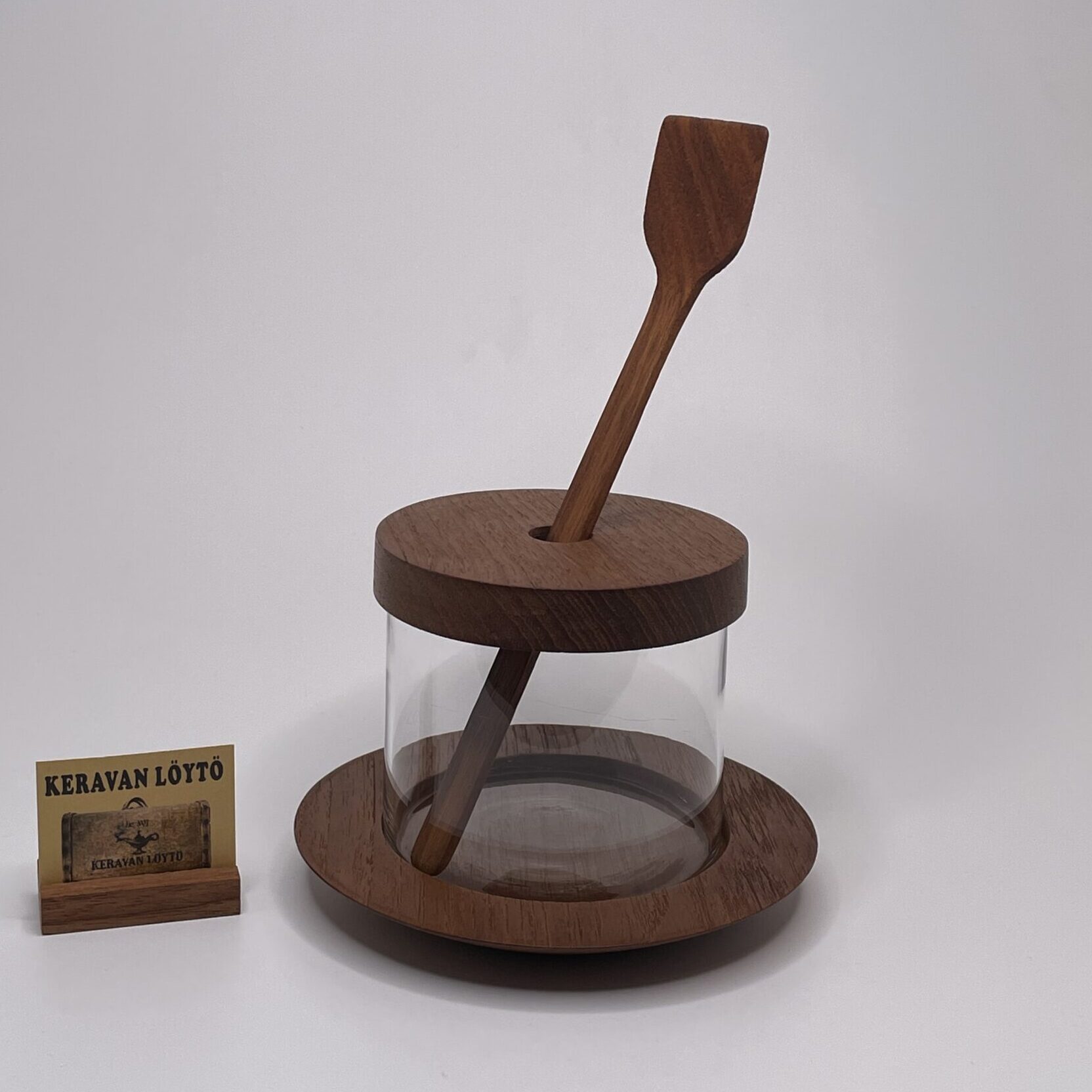 SOLD/MYYTY | Nanny Still | Noormarkun käsityöt | Glass jam jar with wooden lid, saucer and spoon | Signature