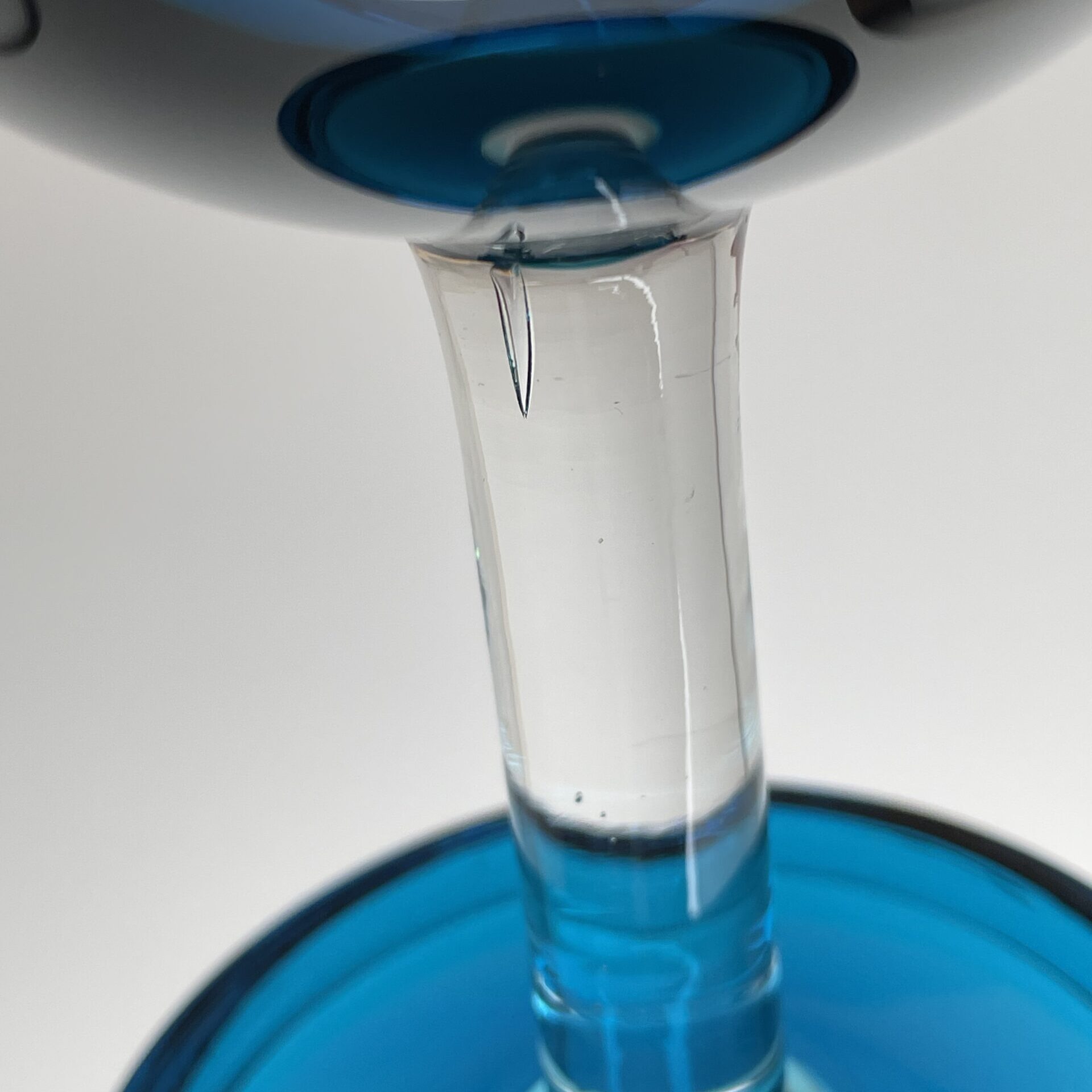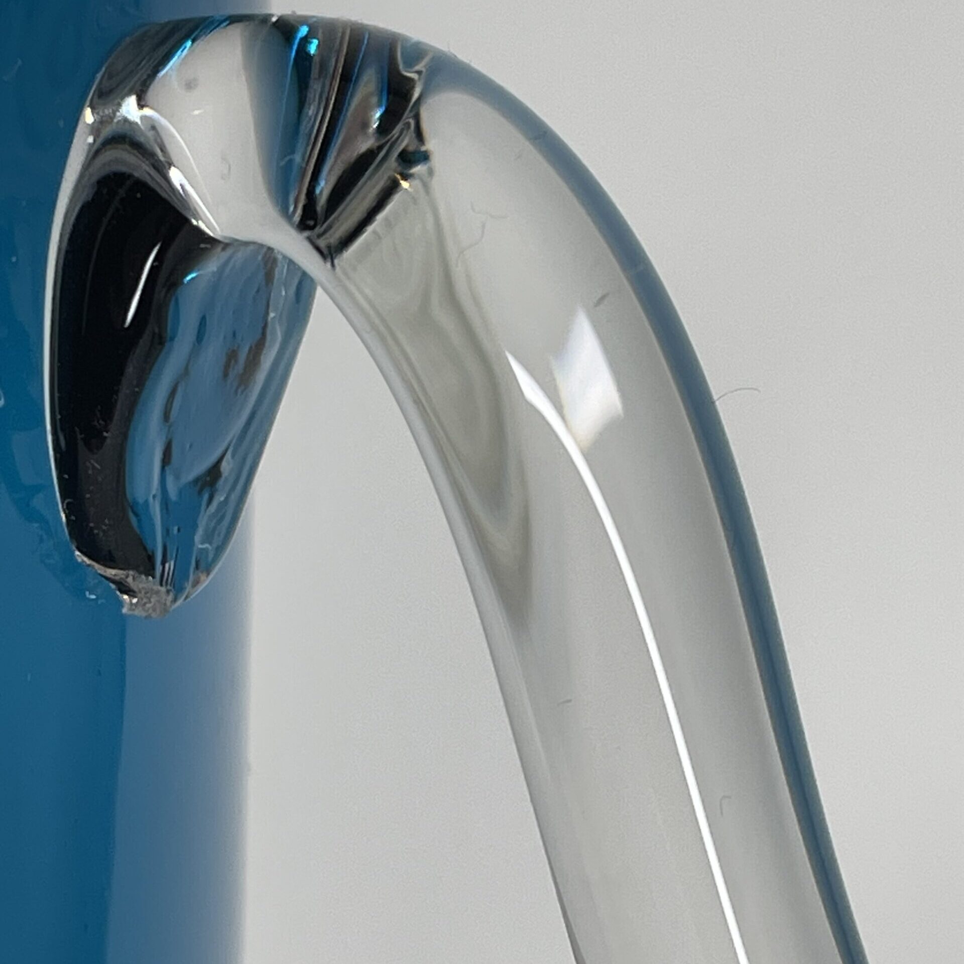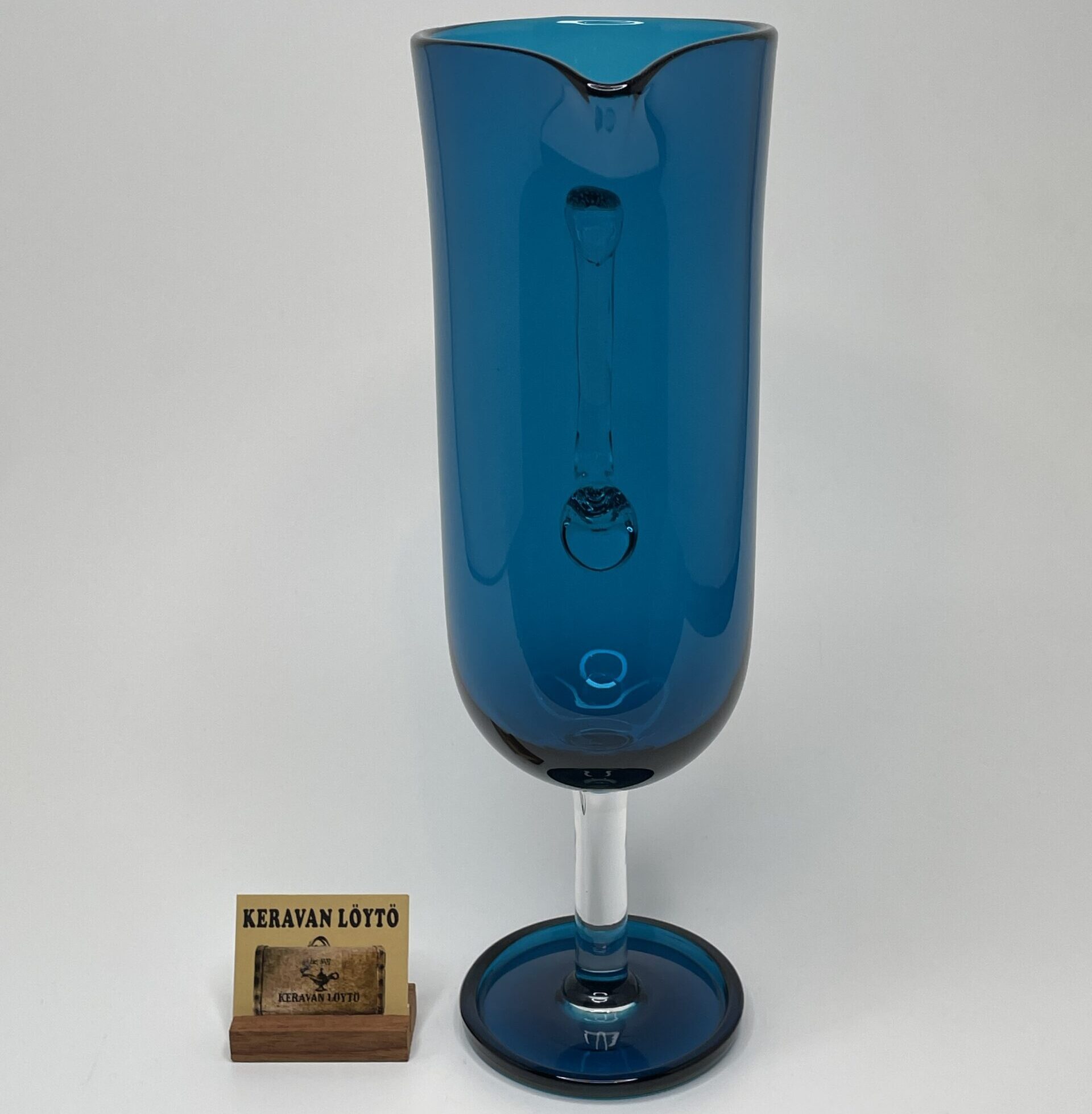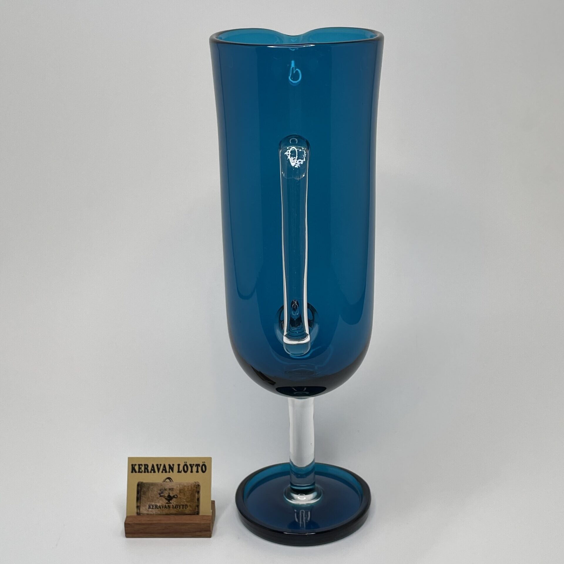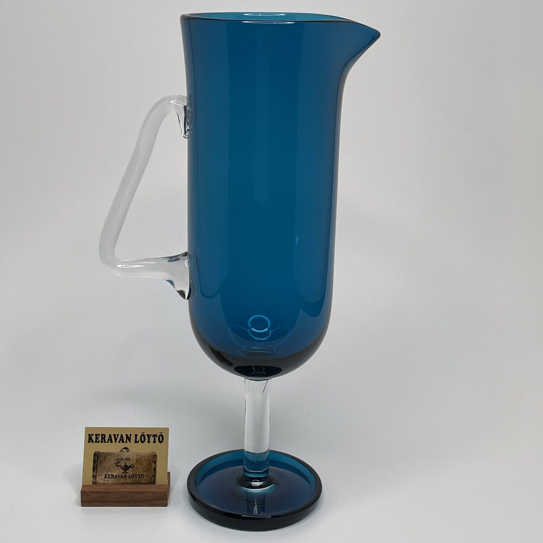 Observations: Some wear and glass streaks (lasijuovia) on one side that may be visible against the light. One bigger air bubble in the foot. A crack at the base of the glass handle. See more details in the pictures.